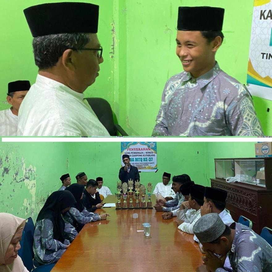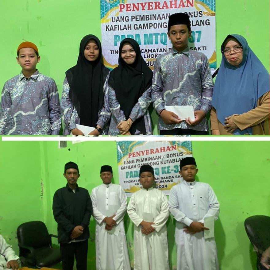 Qari dan Qariah dari Gampong Kuta Blang yang berhasil meraih juara pada MTQ Kecamatan Banda Sakti Kota Lhokseumawe beberapa hari yang lalu menerima bonus dari pemerintah Gampong Kuta Blang. Penyerahan bonus dilakukan pada Jumat malam, 16 Agustus 2024 di ruang pertemuan lantai I Masjid Baitul Huda Kuta Blang.